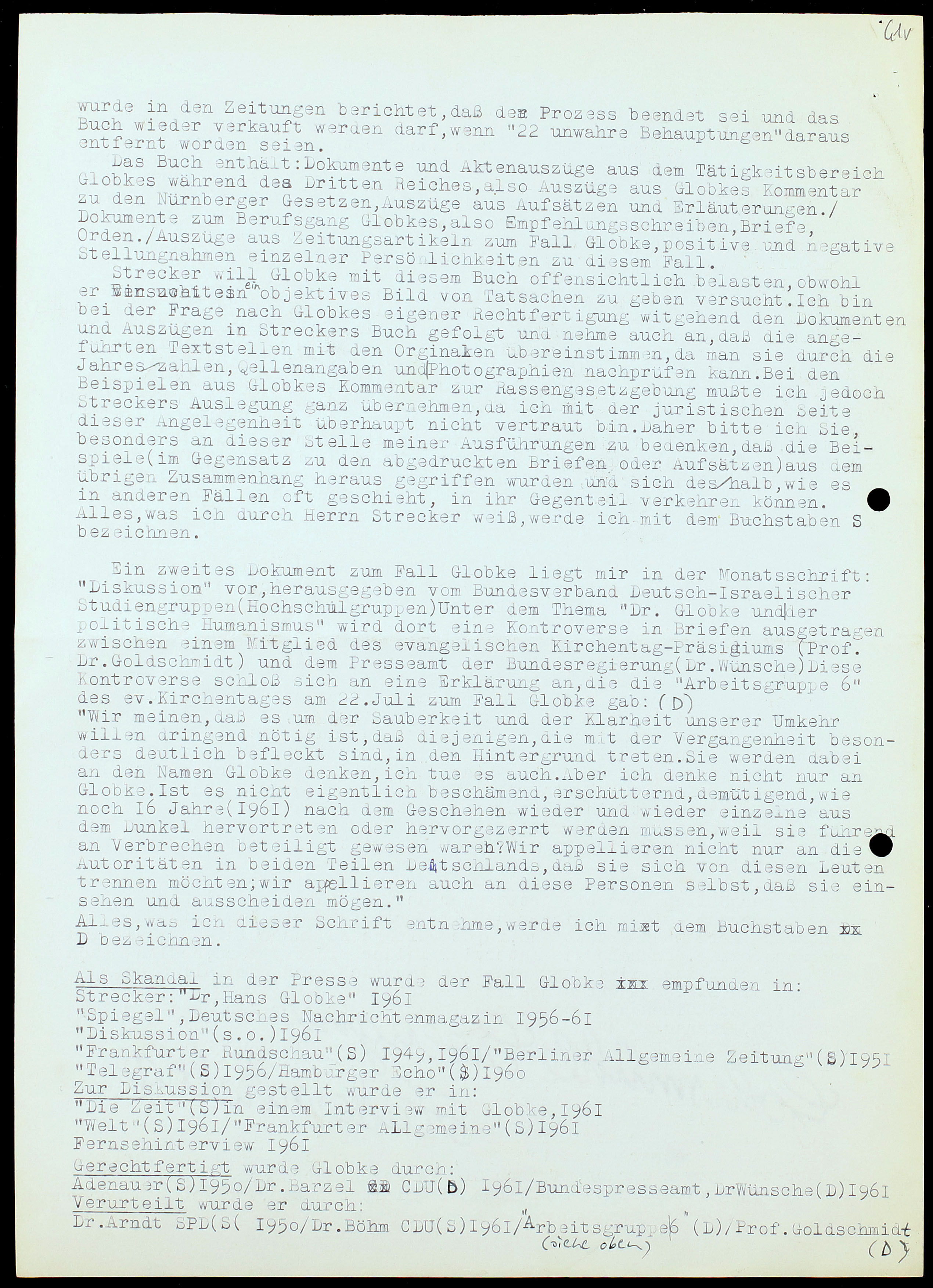 Dr. Arndt SPD (S) 1950 / Dr. Böhm CDU (S) 1961 / „Arbeitsgruppe 6” (siehe oben)[31] (D) / Prof . Goldschmidt (D).[32] Wie und wodurch sich Globke selbst rechtfertigt, entnehme ich dem Interview mit der Zeitung „Die Zeit” und den Protokollen der Zeugenaussagen Globkes bei den Nürnberger Prozessen 1945 (S)