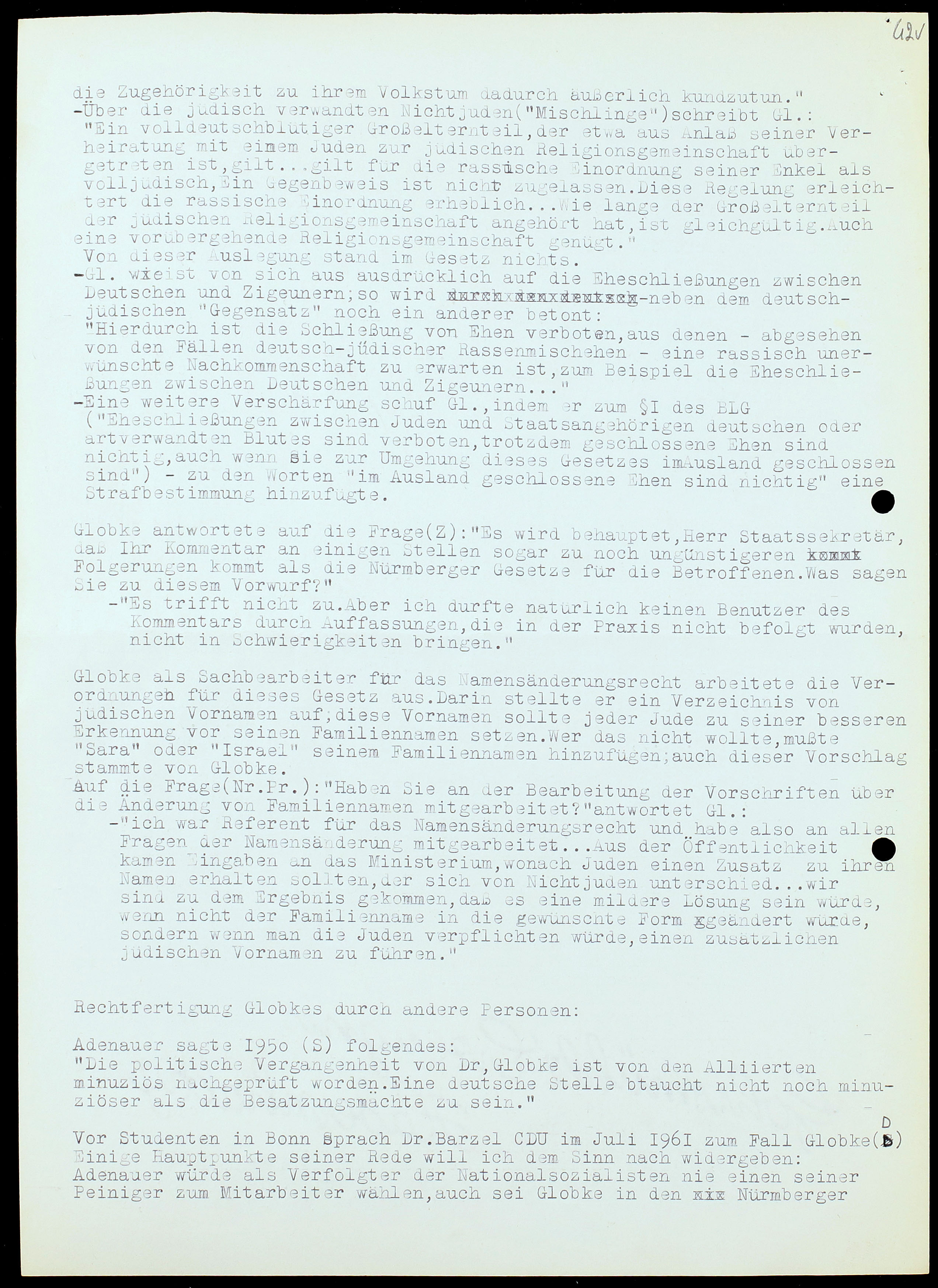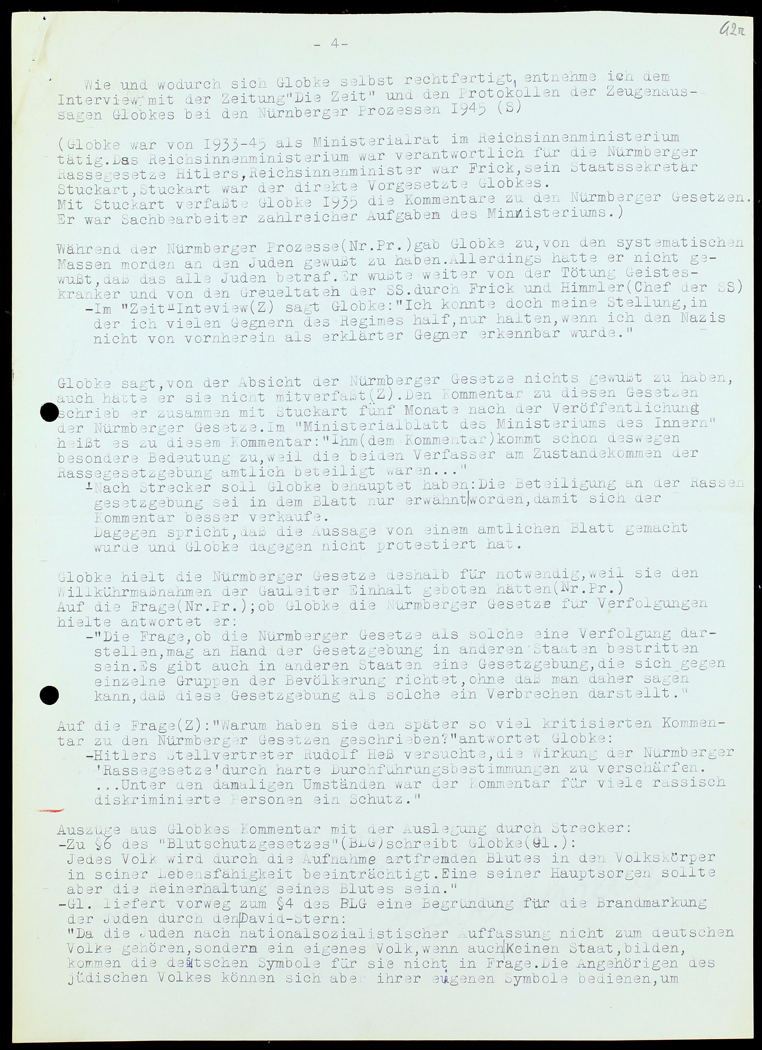 Auf die Frage (Z): „Warum haben sie den später so viel kritisierten Kommentar zu den Nürmberger Gesetzen geschrieben?” antwortet Globke:
