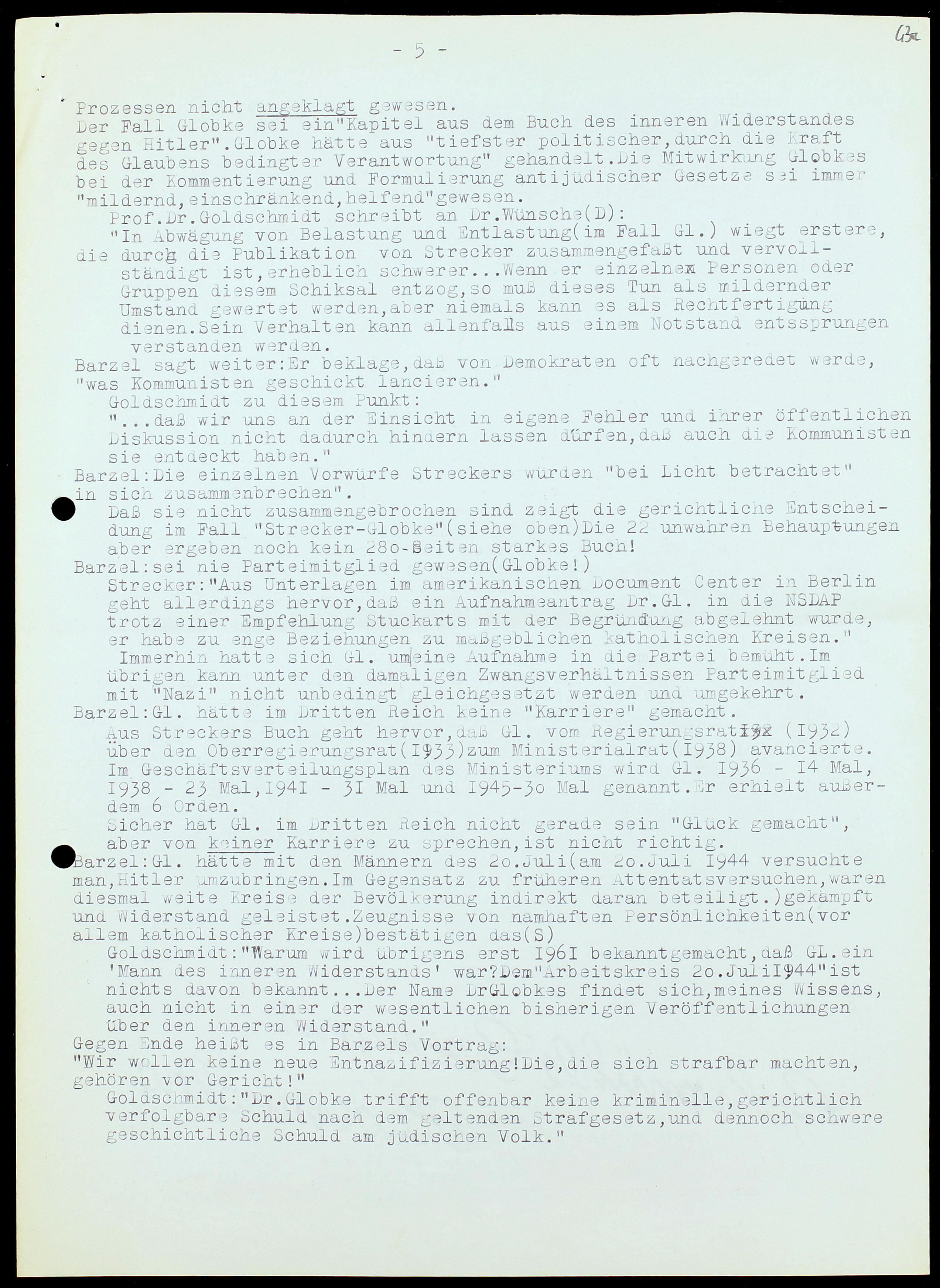 Strecker: «Dai documenti in mano al Centro Documentazione Americano a Berlino si ricava che una domanda di iscrizione al NSDAP del Dr. Globke è stata respinta colla motivazione che egli aveva relazioni troppo strette coi circoli direttivi cattolici».