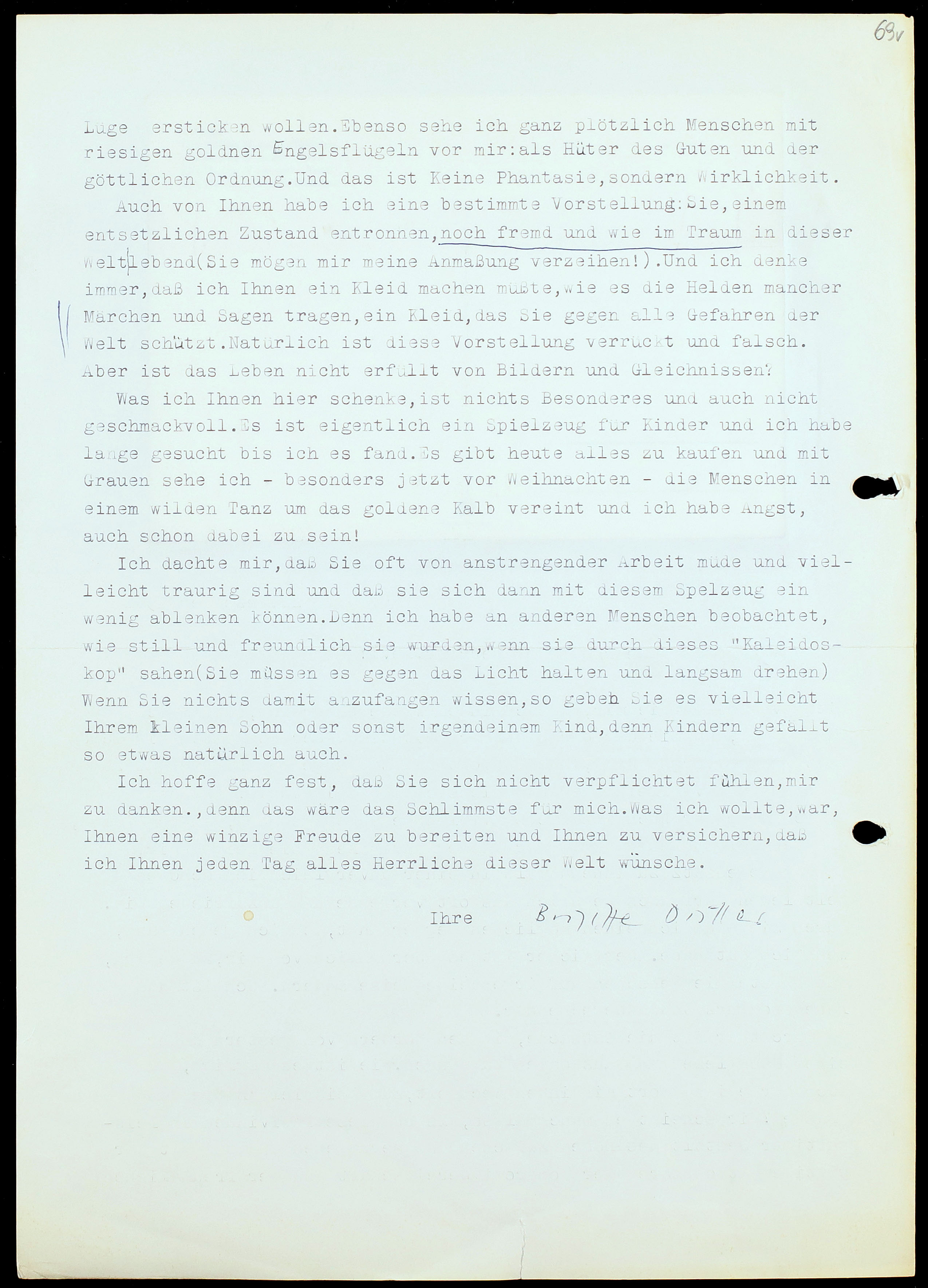 Ich dachte mir, daß Sie oft von anstrengender Arbeit müde und vielleicht traurig sind und daß sie sich dann mit diesem Spelzeug ein wenig ablenken können. Denn ich habe an anderen Menschen beobachtet, wie still und freundlich sie wurden, wenn sie durch dieses “Kaleidoskop”[5] sahen (Sie müssen es gegen das Licht halten und langsam drehen) Wenn Sie nichts damit anzufangen wissen, so geben Sie es vielleicht Ihrem kleinen Sohn oder sonst irgendeinem Kind, denn Kindern gefällt so etwas natürlich auch.