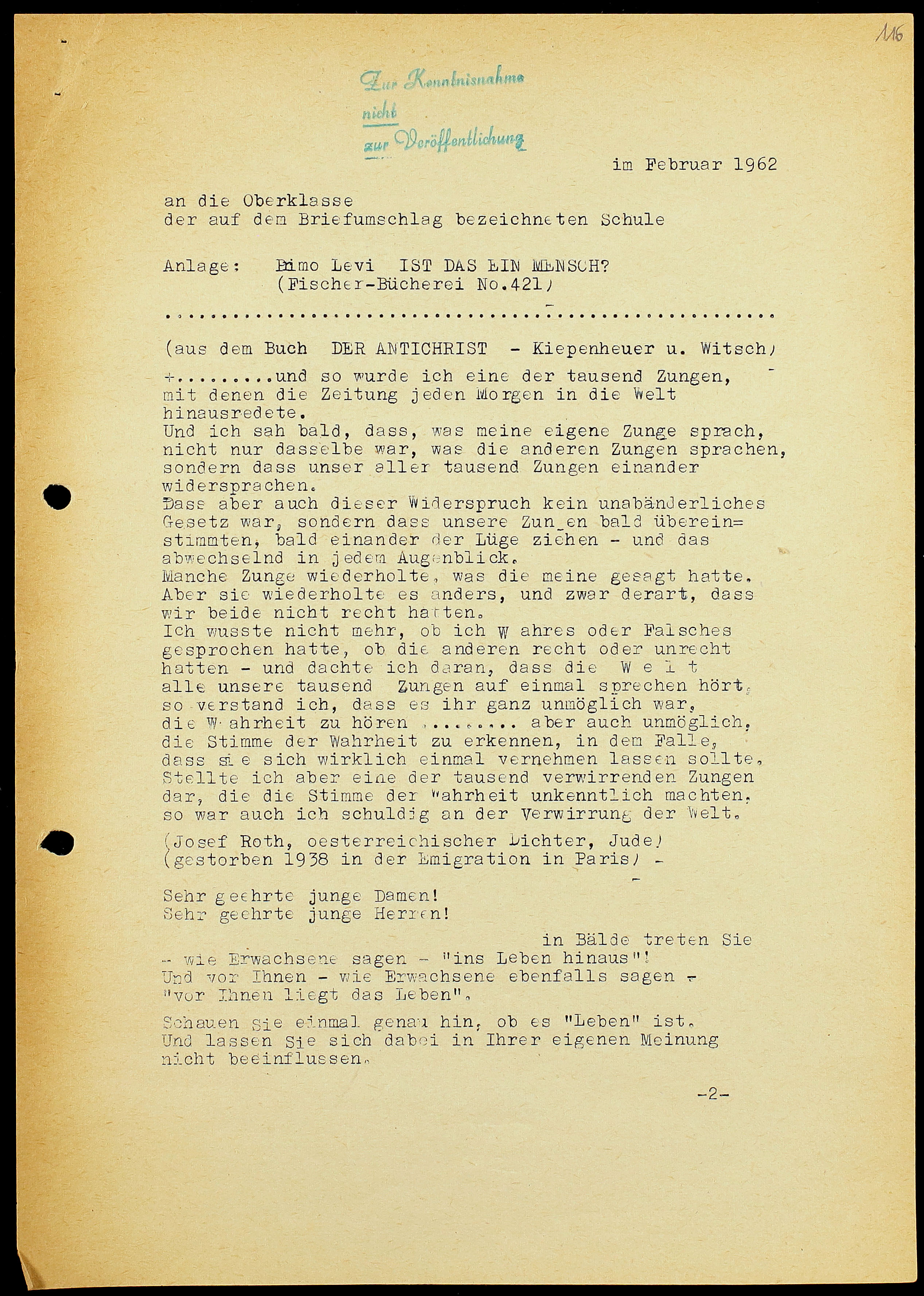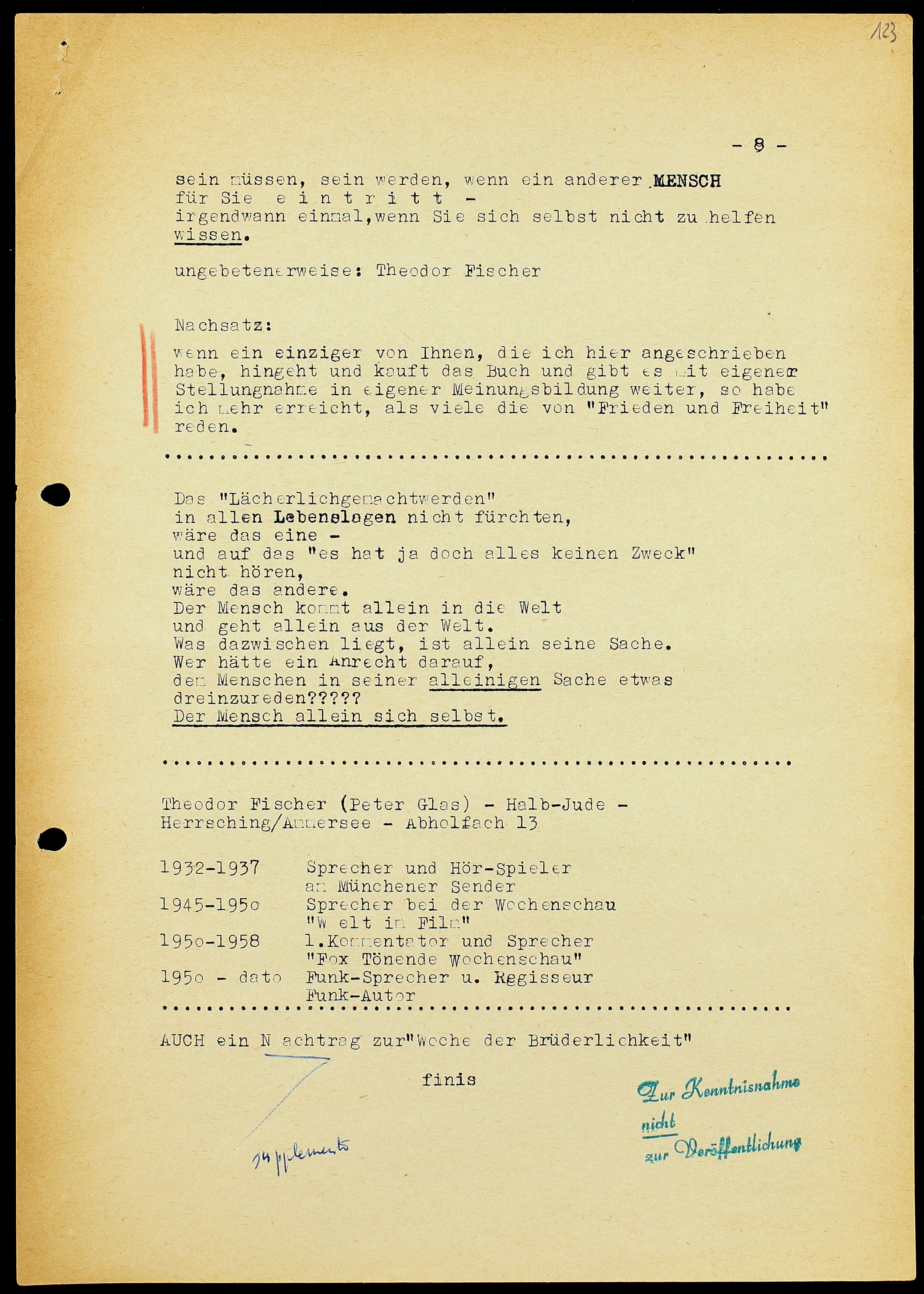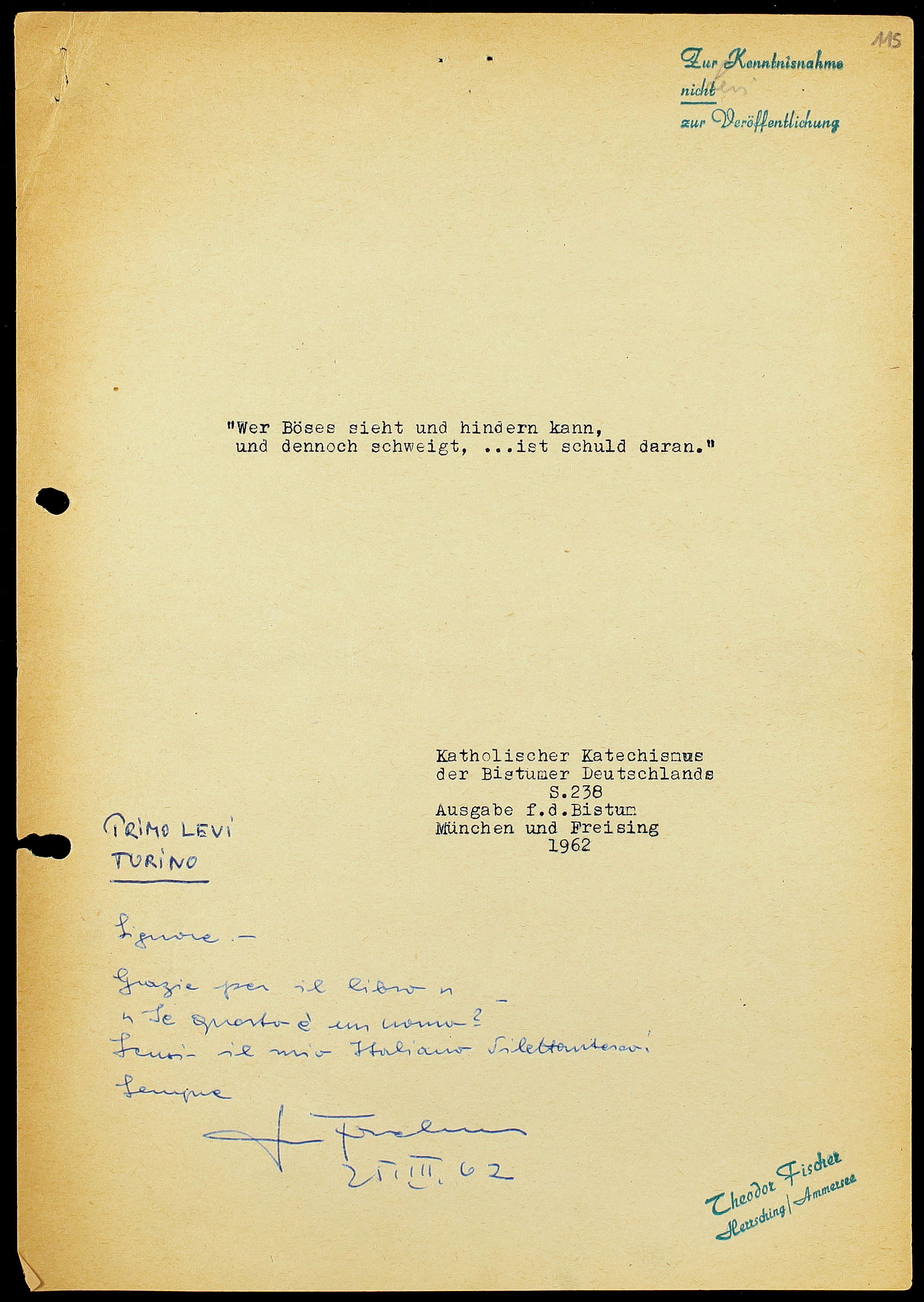 Theodor Fischer, commentatore radiofonico, scrive a Levi una lettera di poche parole di ringraziamento per SQU alla quale aggiunge due allegati: una lettera circolare inviata ad alcuni intellettuali, e delle circolari indirizzate agli alunni di alcune scuole di Monaco e dintorni.