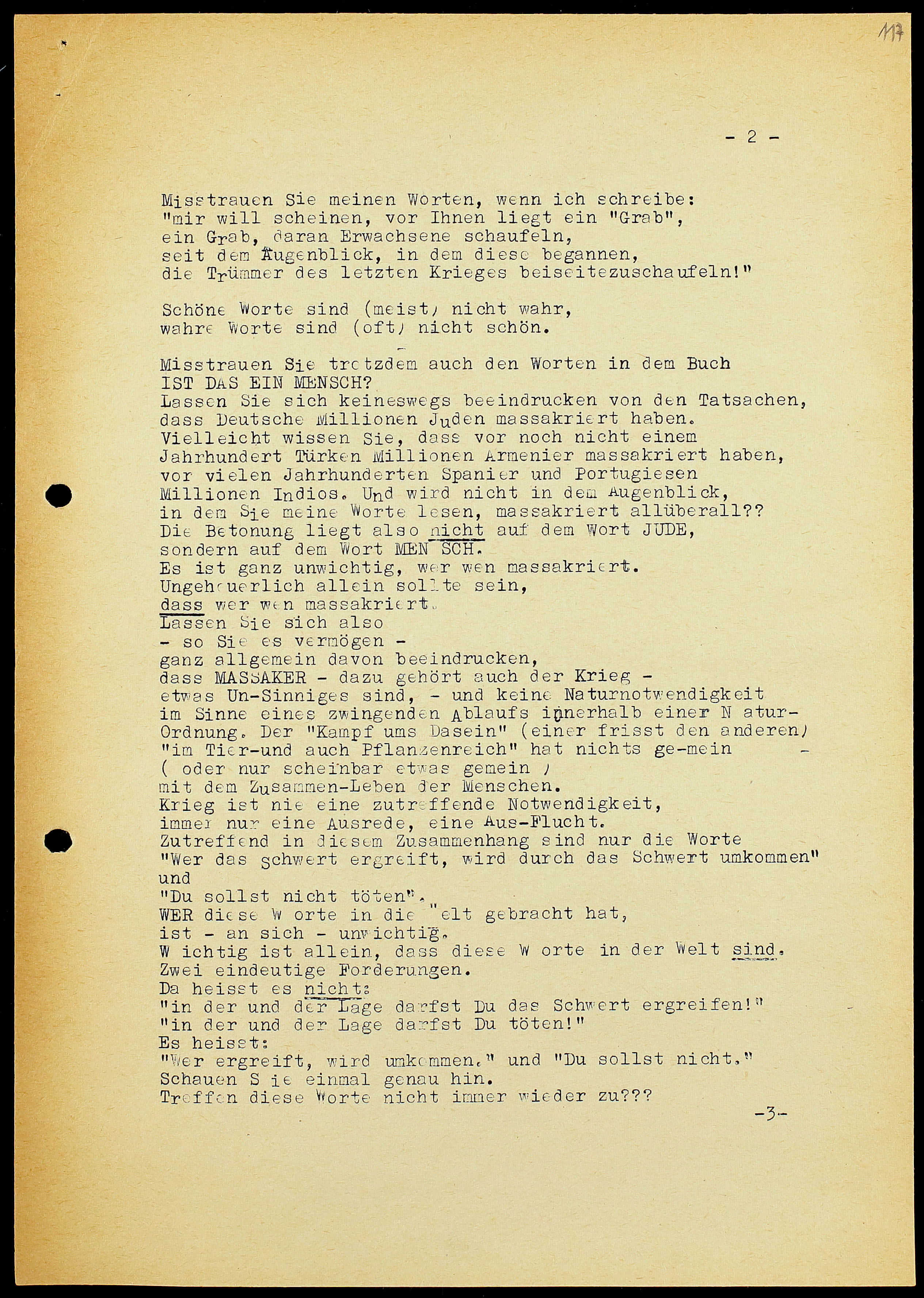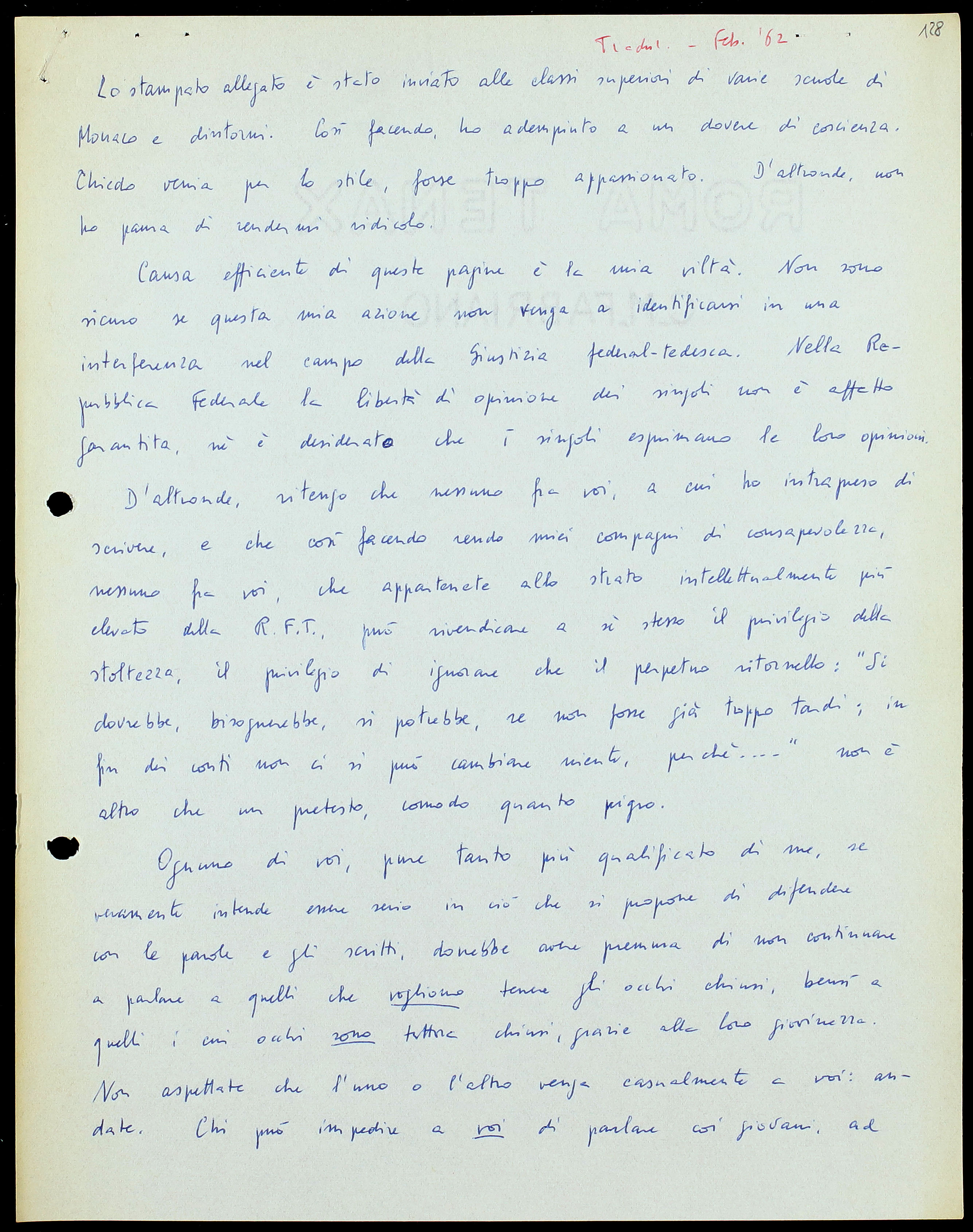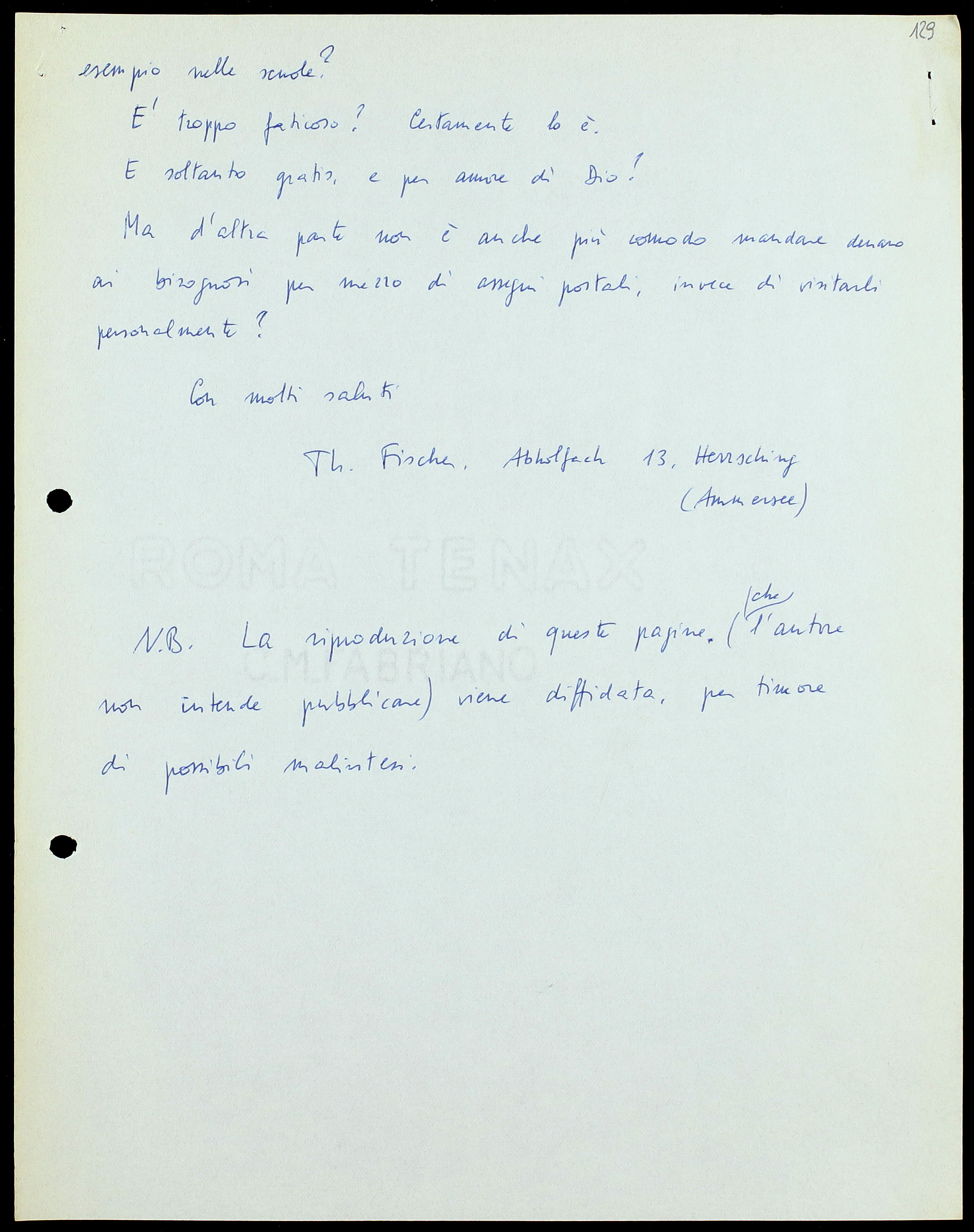 Theodor Fischer, commentatore radiofonico, scrive a Levi una lettera di poche parole di ringraziamento per SQU alla quale aggiunge due allegati: una lettera circolare inviata ad alcuni intellettuali, e delle circolari indirizzate agli alunni di alcune scuole di Monaco e dintorni.