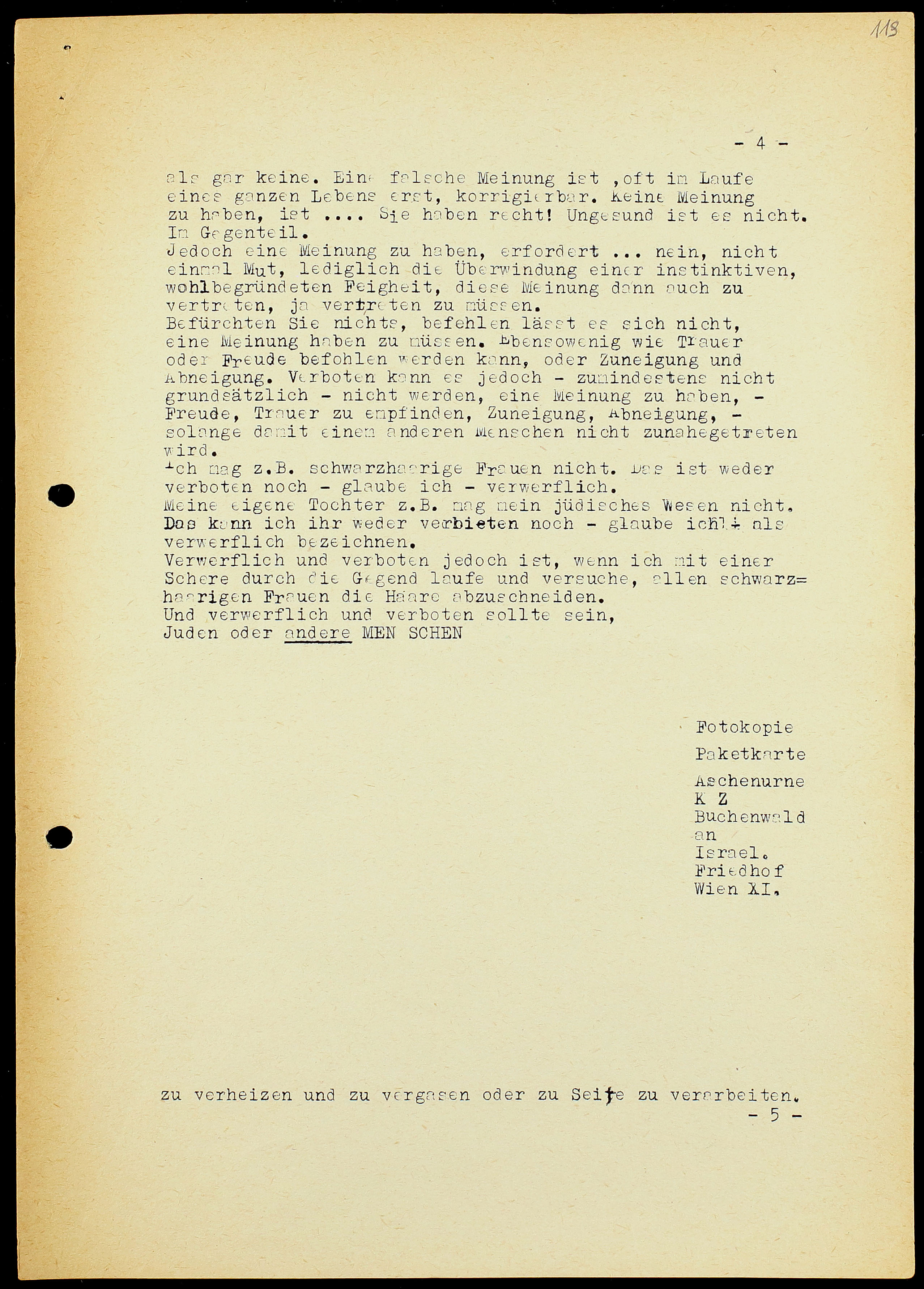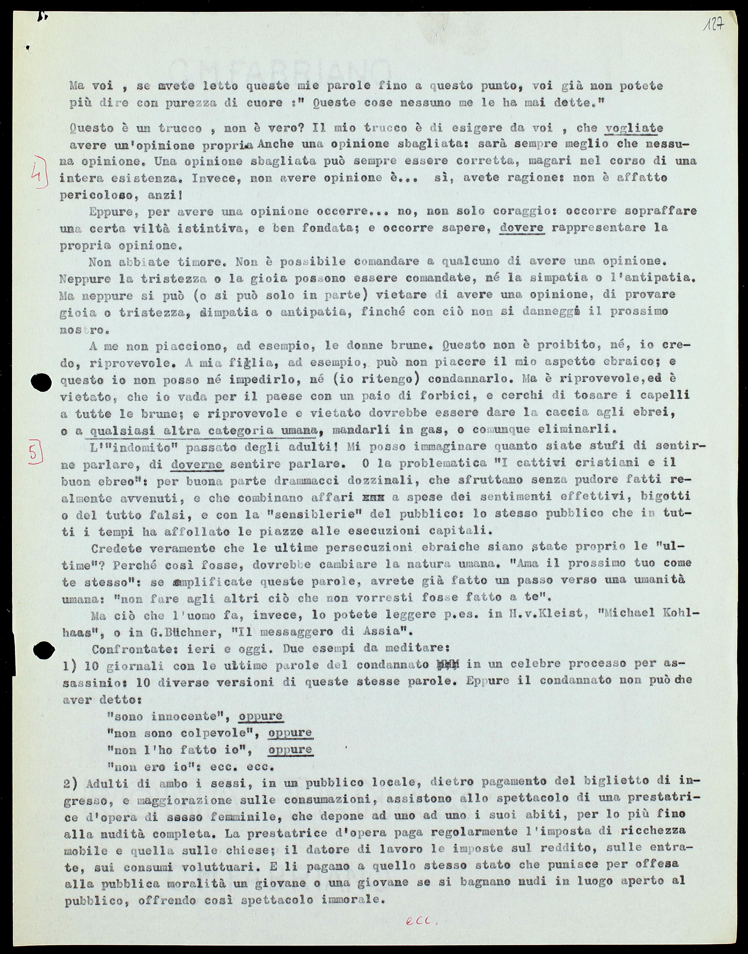 A me piacciono, ad esempio, le donne brune. Questo non è proibito, né, io credo, riprovevole. A mia figlia, ad esempio, può non piacere il mio aspetto ebraico; e questo io non posso né impedirlo, né (io ritengo) condannarlo. Ma è riprovevole, ed è vietato, che io vada per il paese con un paio di forbici, e cerchi di tosare i capelli a tutte le brune; e riprovevole e vietato dovrebbe essere dare la caccia agli ebrei, o a qualsiasi altra categoria umana, mandarli in gas, o comunque eliminarli.
