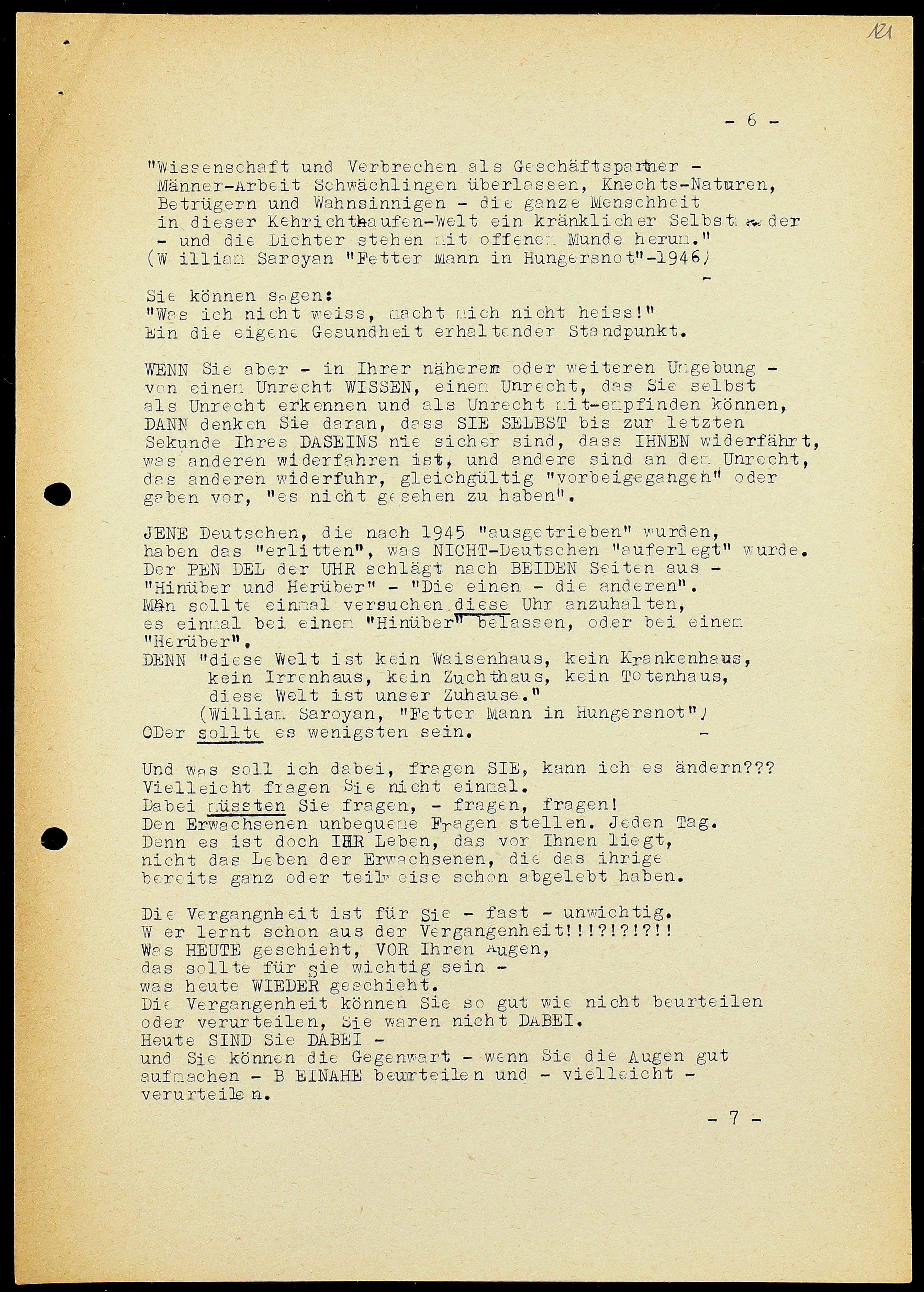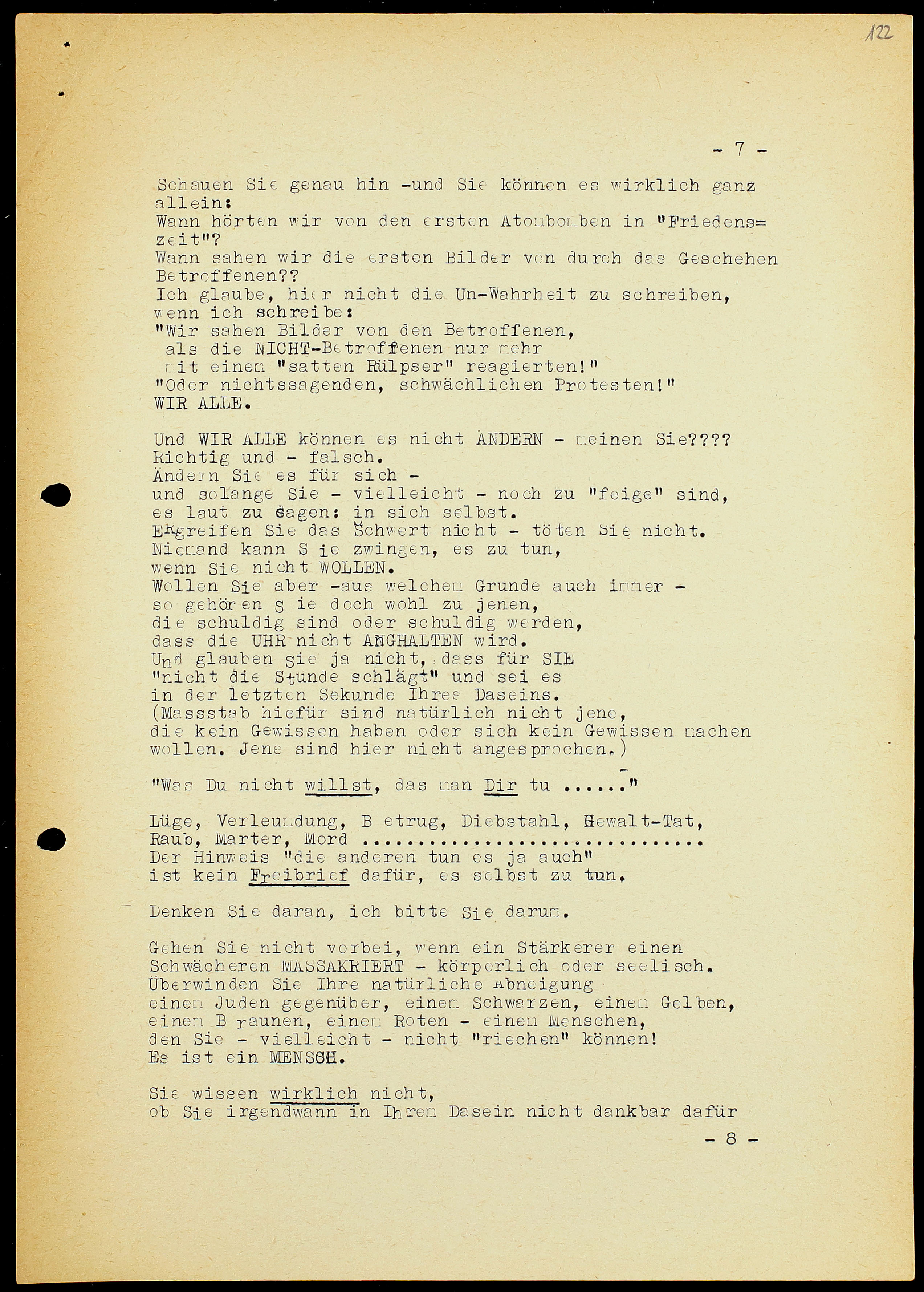 Jeder von Ihnen, doch weitaus berufener als ich, sollte, wenn es ihm damit, wofür er in Wort und Schrift einzutreten vorgibt, wirklich ernst sein sollte, – jeder von Ihnen sollte es sich angelegen sein lassen, nicht dauernd zu jenen zu sprechen, die ja ihre Augen verschliessen wollen, sondern zu diesen, denen die Augen aufgrund ihrer Jugend noch verschlossen sind.