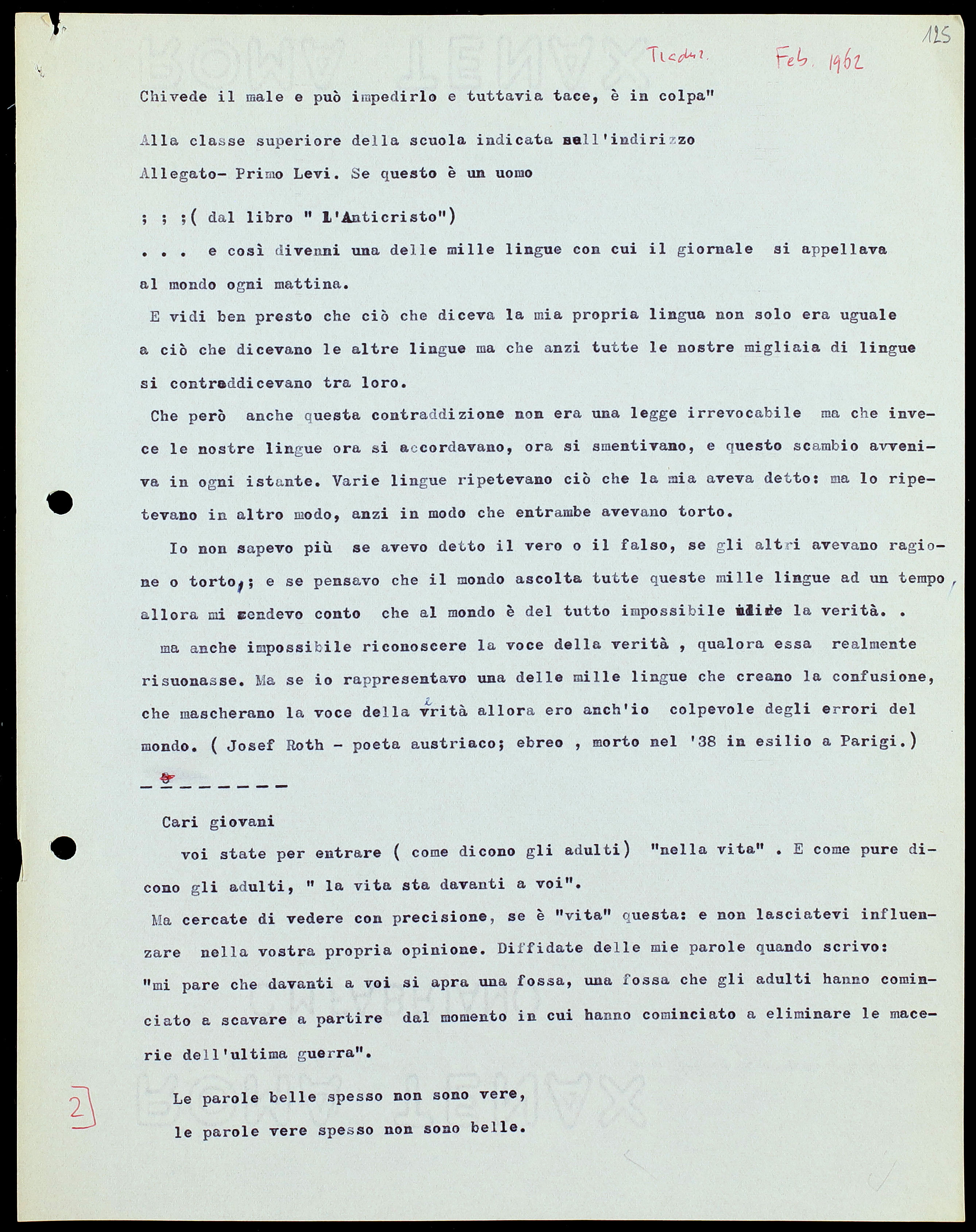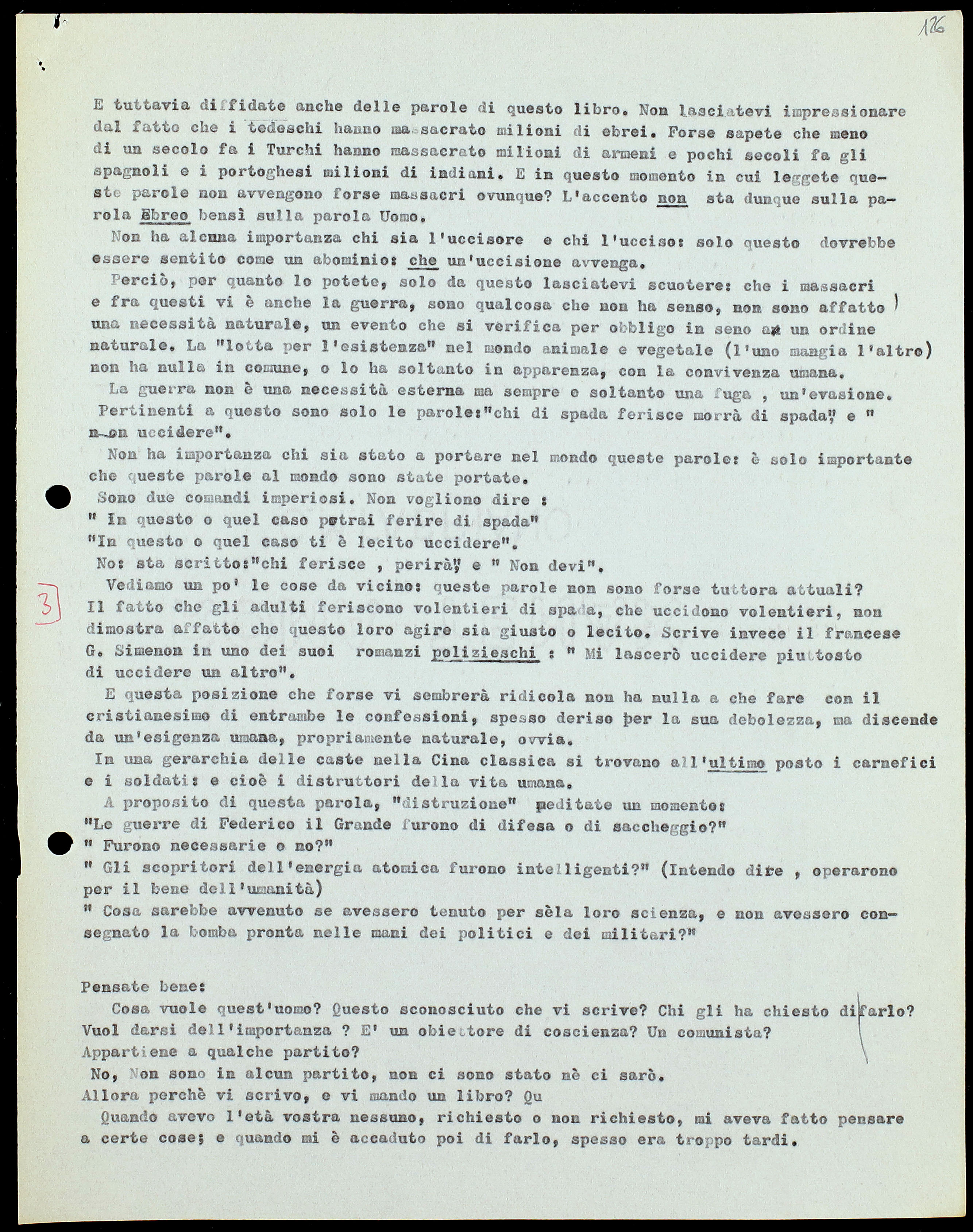 Credete veramente che le ultime persecuzioni ebraiche siano state proprio le «ultime»? Perché se così fosse, dovrebbe cambiare la natura umana. «Ama il prossimo tuo come te stesso»: se amplificate queste parole, avrete già fatto un passo verso una umanità umana: «non fare agli altri ciò che non vorresti fosse fatto a te».