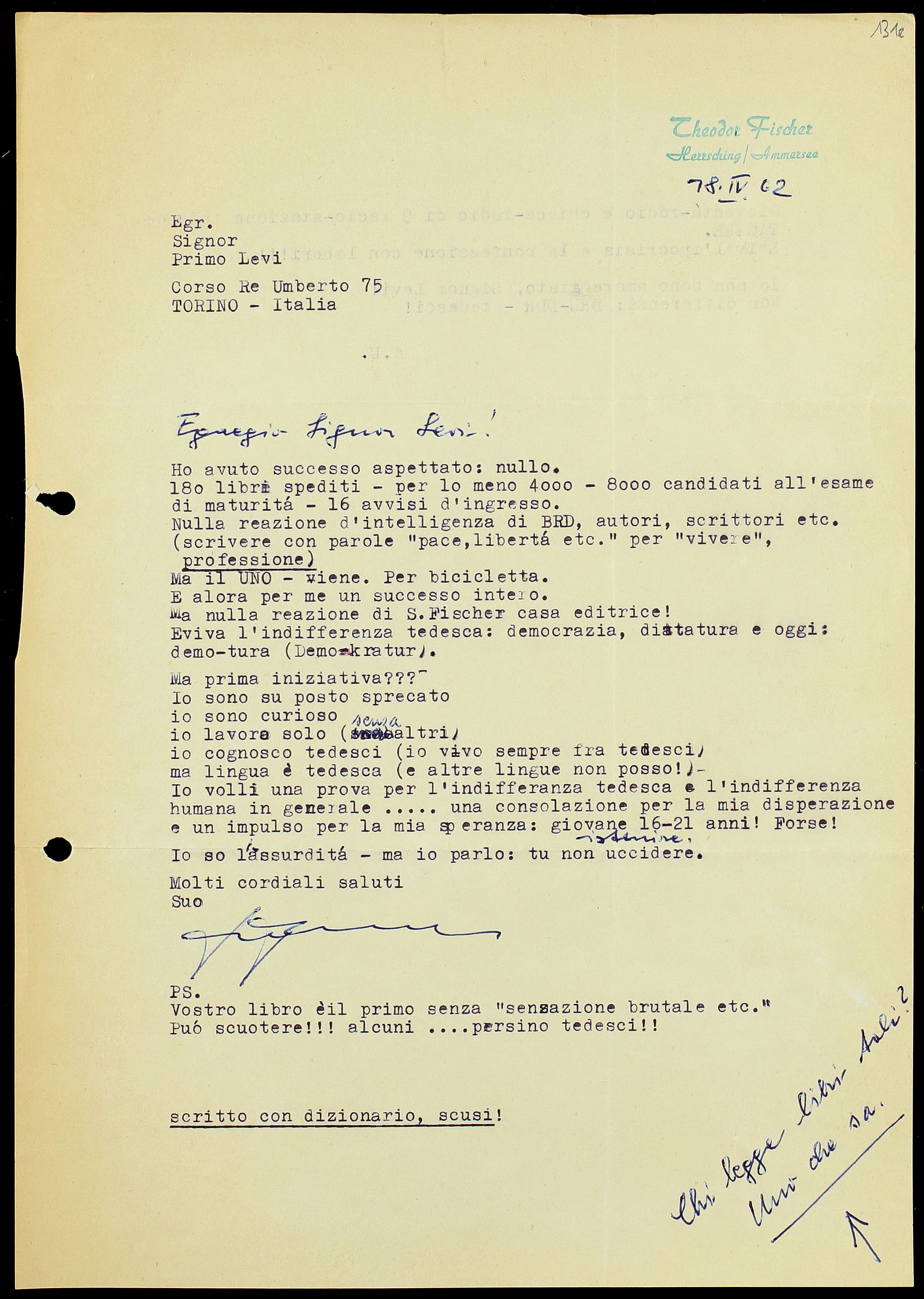 140. Theodor Fischer a Primo Levi, 18 aprile 1962