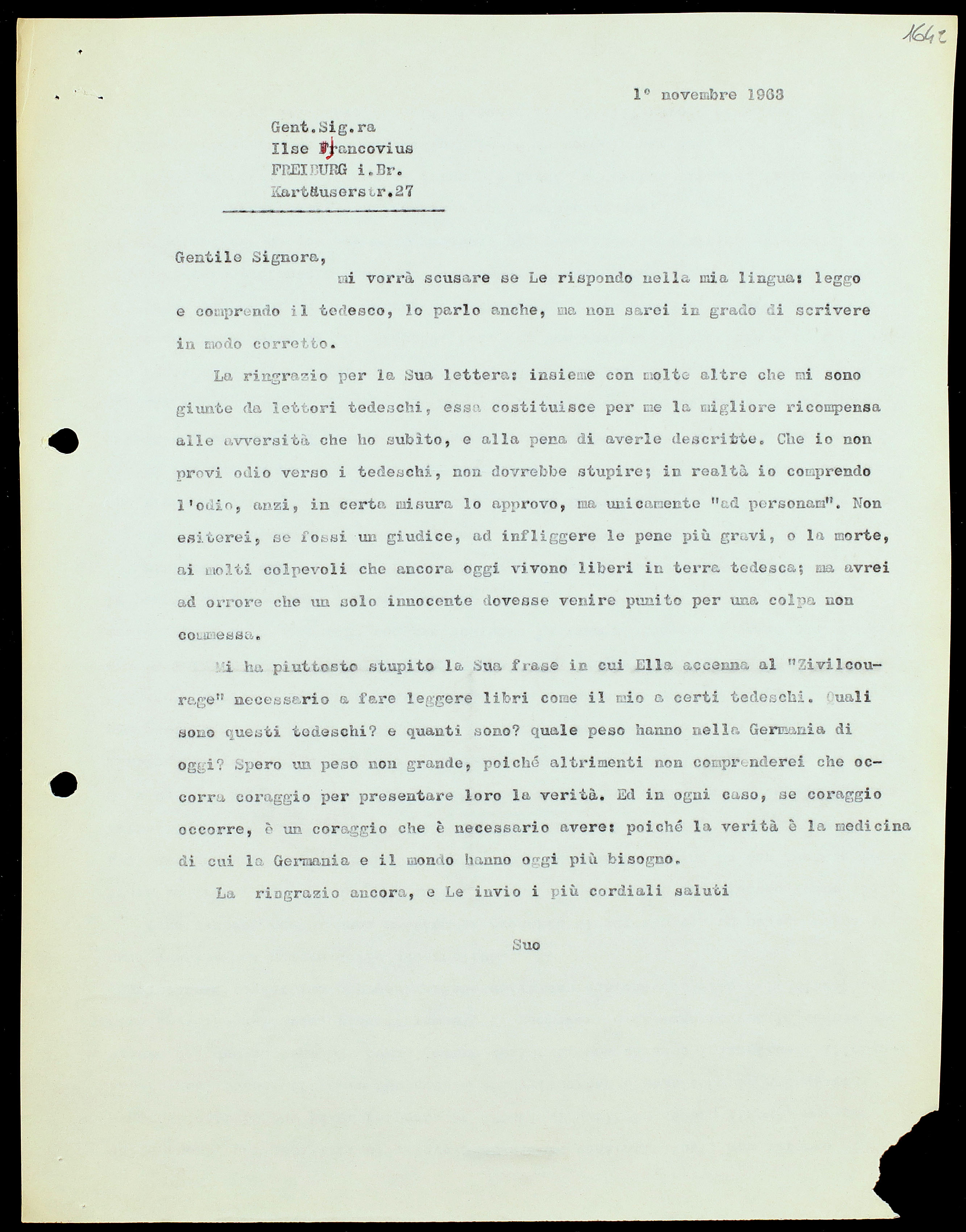 Mi ha piuttosto stupito la Sua frase in cui Ella accenna al «Zivilcourage»[3] necessario a fare leggere libri come il mio a certi tedeschi. Quali sono questi tedeschi? e quanti sono? quale peso hanno nella Germania di oggi? Spero un peso non grande, poiché altrimenti non comprenderei che occorra coraggio per presentare loro la verità. Ed in ogni caso, se coraggio occorre, è un coraggio che è necessario avere: poiché la verità è la medicina di cui la Germania e il mondo hanno oggi più bisogno.