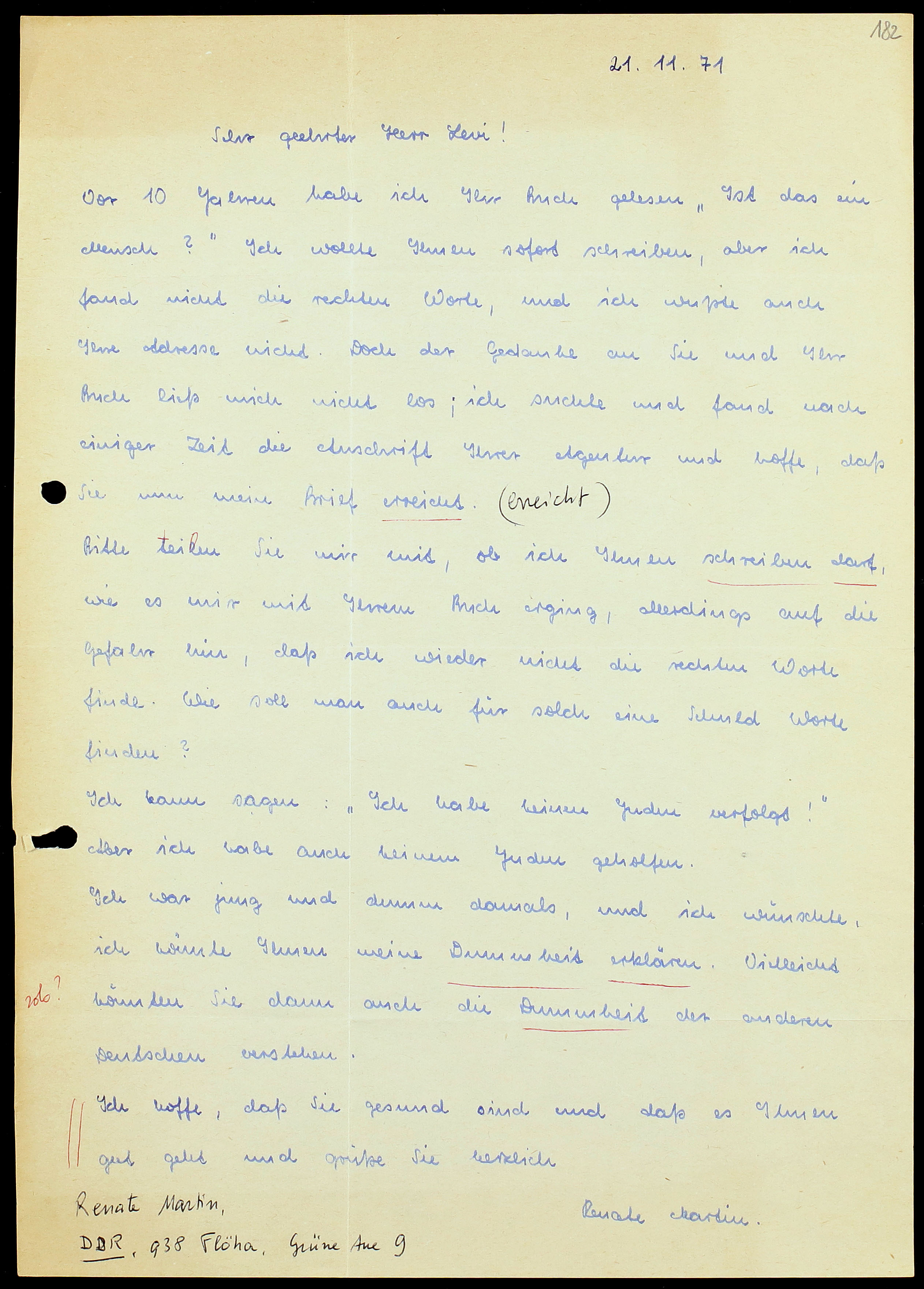 Renate Martin, insegnante di Flöha (Germania Est), con questa breve lettera chiede a Levi di potergli scrivere per tentare di spiegare la “stupidità” di allora.