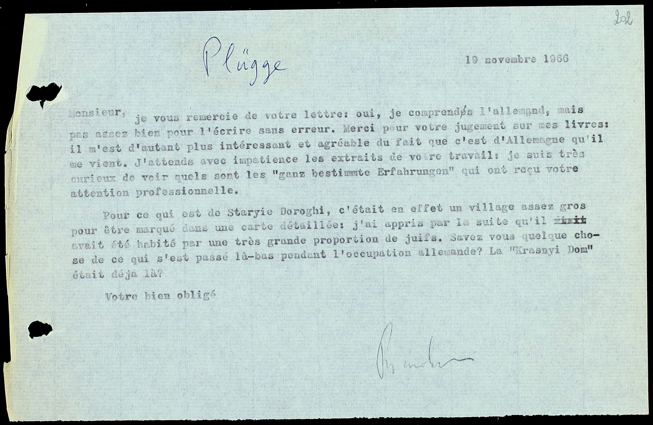 je vous remercie de votre lettre: oui, je comprends lâallemand, mais pas assez bien pour lâĂ©crire sans erreur. Merci pour votre jugement sur mes livres: il mâest dâautant plus intĂ©ressant et agrĂ©able du fait que câest dâAllemagne quâil me vient. Jâattends avec impatience les extraits de votre travail: je suis trĂšs curieux de voir quels sont les âganz bestimmte Erfahrungenâ qui ont reçu votre attention professionnelle.