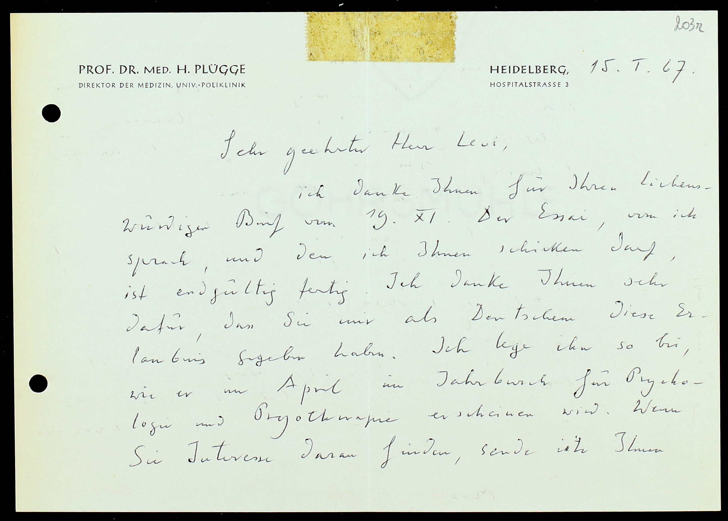 ich danke Ihnen für Ihren liebenswürdigen Brief vom 19.XI. Der Essai, vom ich sprach, und den ich Ihnen schicken darf, ist endgültig fertig. Ich danke Ihnen sehr dafür, dass Sie mir als Deutschem diese Erlaubnis gegeben haben. Ich lege ihn so bei, wie er im April im Jahrbuch für Psychologie und Psychotherapie erscheinen wird. Wenn Sie Interesse daran finden, sende ich Ihnen denn gern einen Sonderdruck.