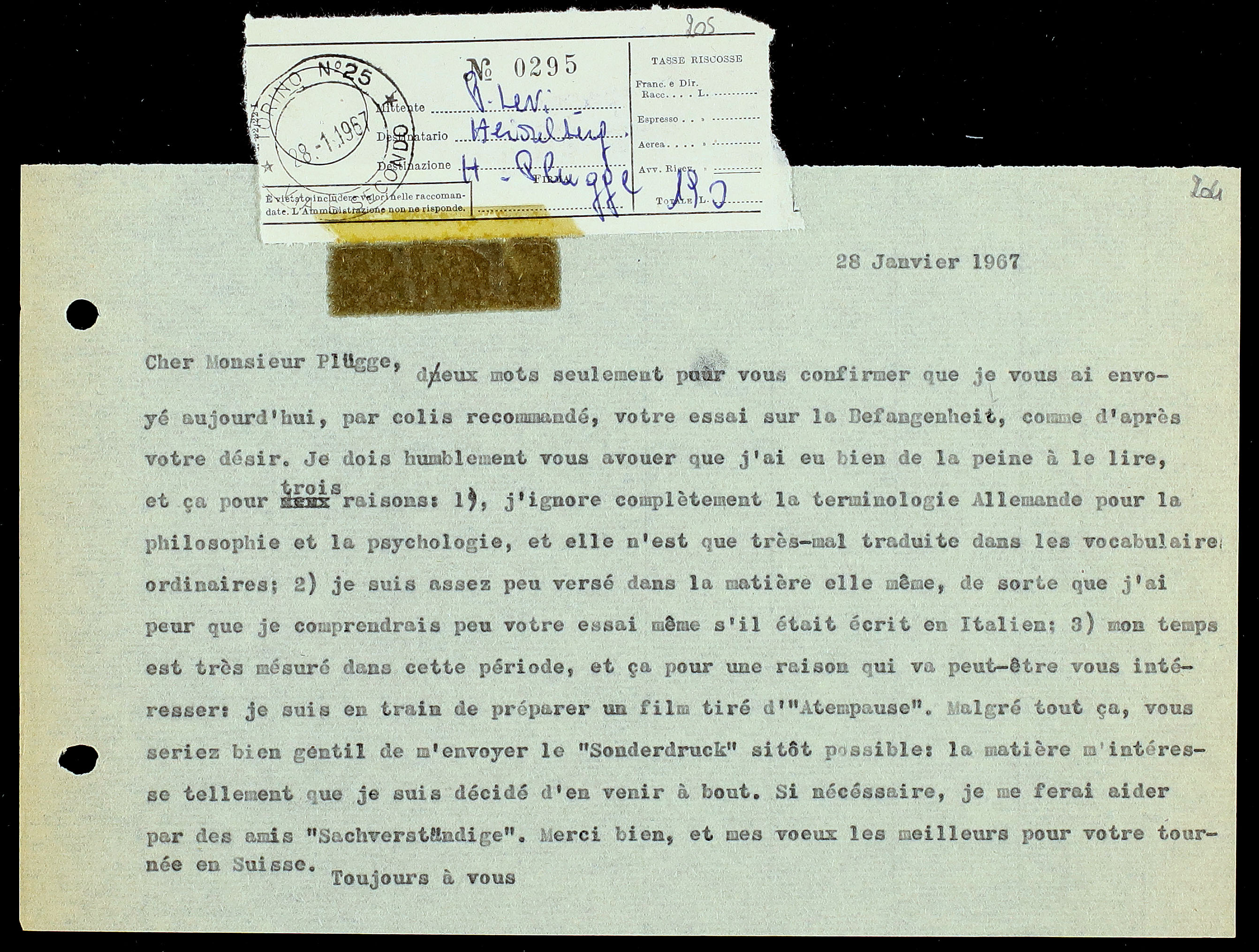 159. Primo Levi a Herbert PlĂŒgge, 28 gennaio 1967