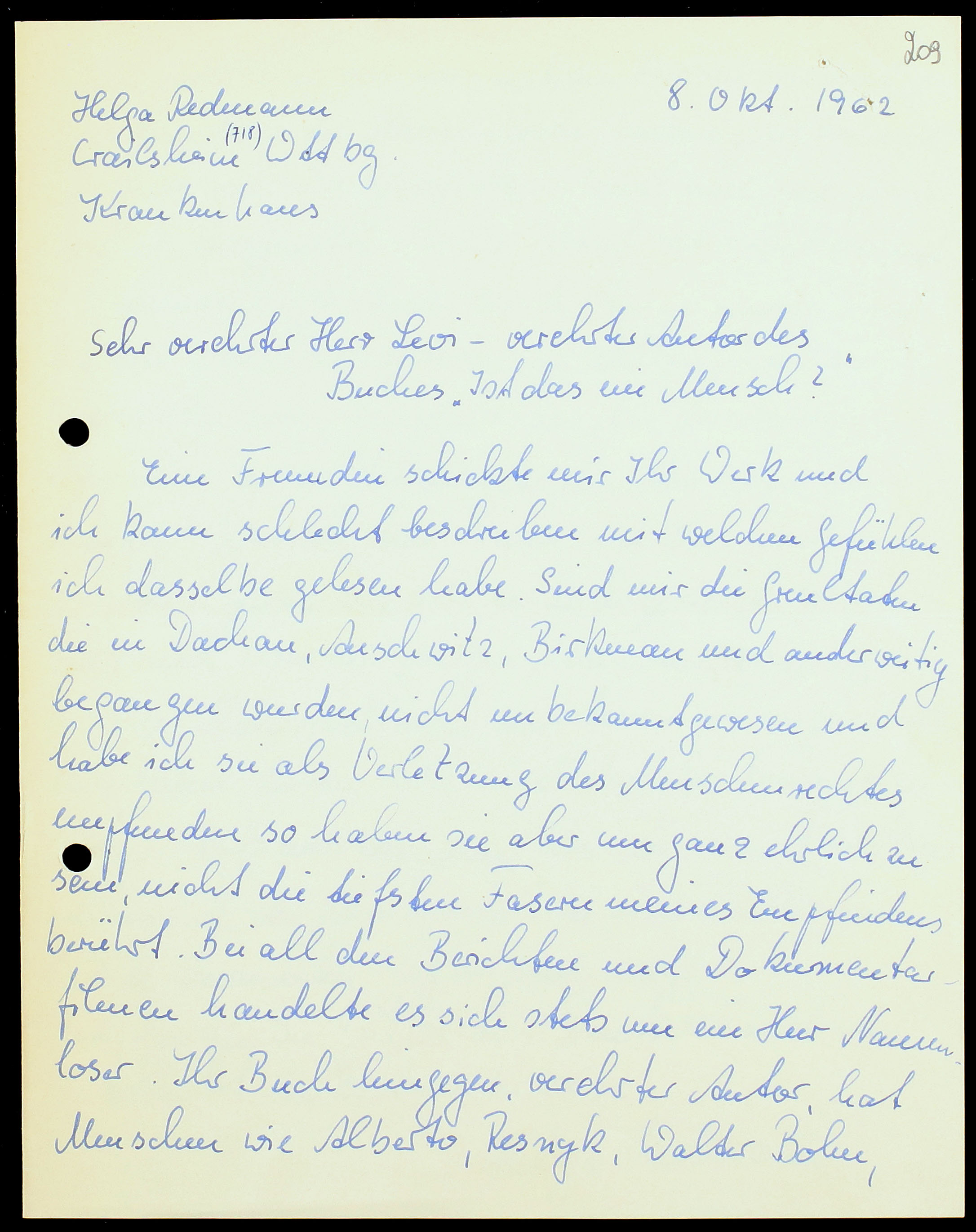 161. Helga Redmann a Primo Levi, 8 ottobre 1962