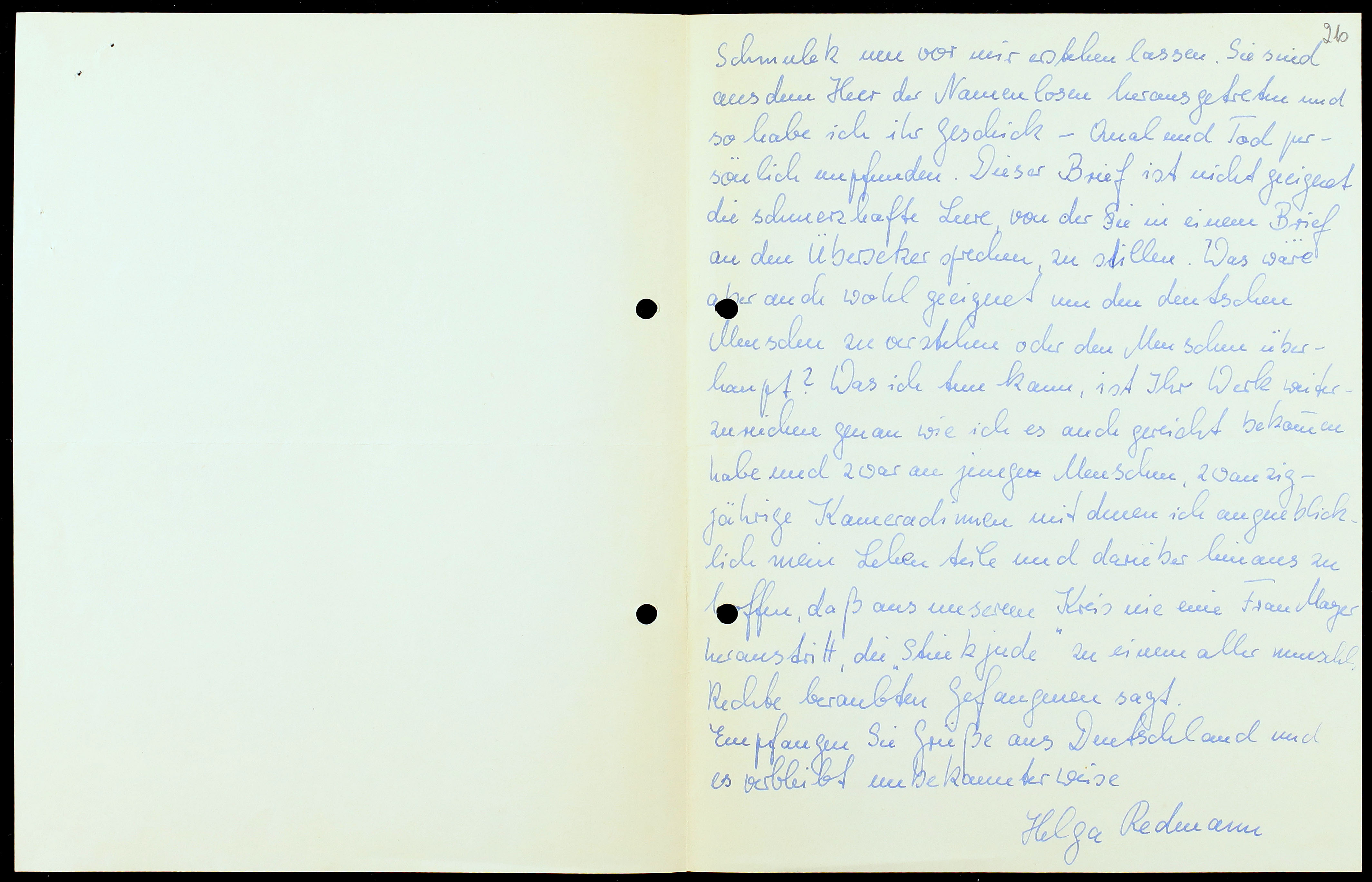 Eine Freundin schickte mir Ihr Werk und ich kann schlecht beschreiben mit welchen Gefühlen ich dasselbe gelesen habe. Sind mir die Gräueltaten die in Dachau, Auschwitz, Birkenau und anderweitig begangen wurden, nicht im bekannt gewesen und habe ich sei als Verletzung des Menschenrechts empfunden so haben sie als im ganz ehrlich zu sein, nicht die die felsen Fasere meines Empfindens berütot. Bei all den Berichten und Dokumentarfilmen handelte es sich stets um ein Heer Namenlosen. Ihr Buch hingegen, verehrter Autor, hat Menschen wie Alberto,[2] Resnyk,[3] Walter Bonn, Schmulek[4] um vor mir erstehen lassen. Sie sind aus dem Heer der Namenlosen[5] herausgetreten und so habe ich ihr Geschick – Qual und Tod persönlich empfunden. Dieser Brief ist nicht geeignet die schmerzhafte Leere, von der Sie in einem Brief an den Übersetzer sprechen, zu stillen. Was wäre aber an die wohl geeignet uns den deutschen Menschen zu verstehen oder den Menschen überhaupt? Was ich tun kann, ist Ihr Werk weiterzureichen genau wie ich es auch gereicht bekannt habe mich zwar an jungen Menschen, zwanzigjährige Kameradinnen mit denen ich augenblicklich mein Leben Teile und dareibes hinaus zu hoffen, daß aus unseren Kreis nie eine Frau Mayers herausdritt, dei “Stinkjude” zu einem alles Menschenrechte beraubten Gefangenen sagt.[6]