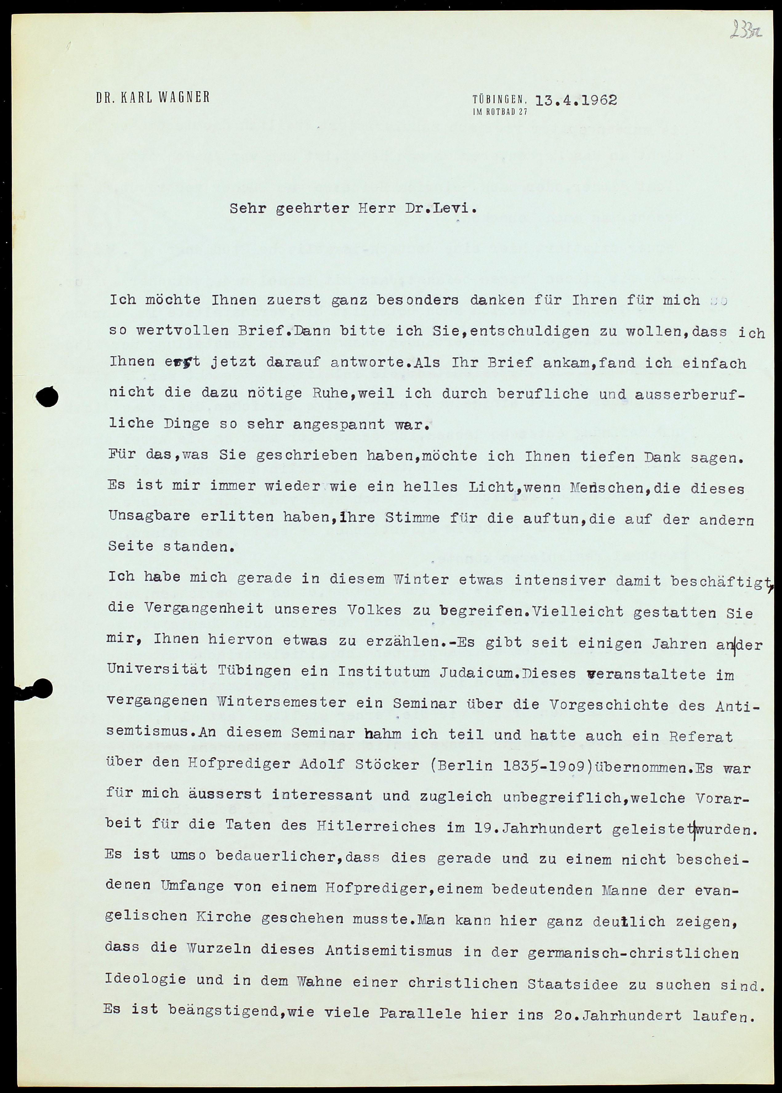 Wagner racconta di un seminario sulle origini dell’antisemitismo tedesco al quale ha preso parte, e informa Levi di aver discusso una tesi di laurea simile alla sua.