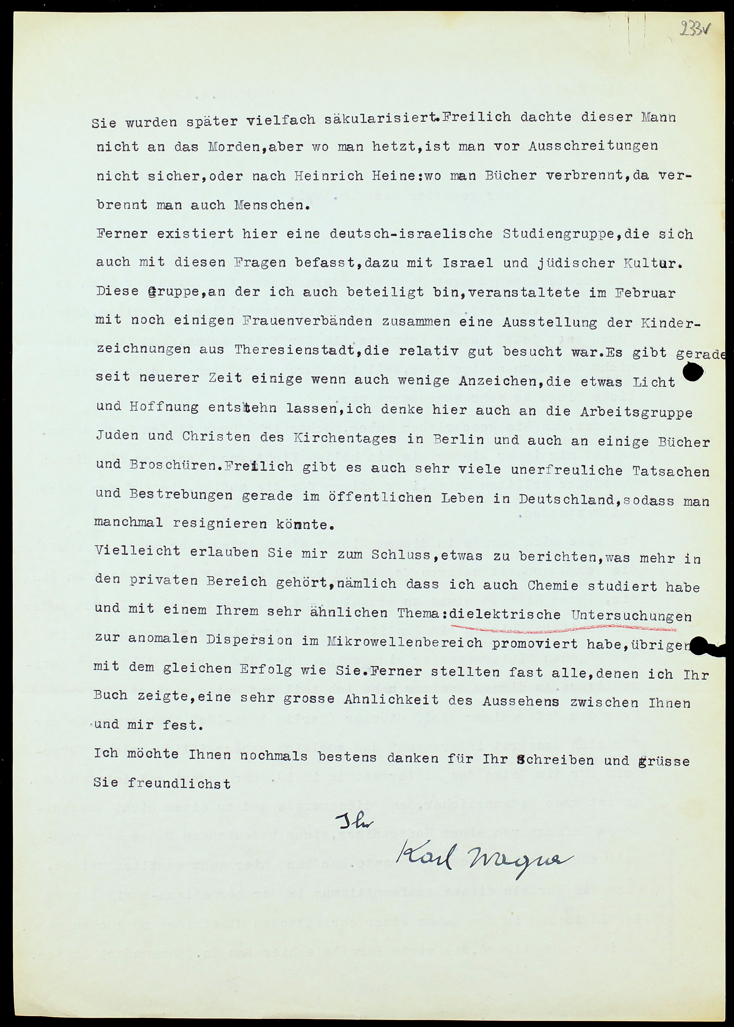 Vielleicht erlauben Sie mir zum Schluss, etwas zu berichten, was mehr in den privaten Bereich gehört, nämlich dass ich auch Chemie studiert habe und mit einem Ihrem sehr ähnlichen Thema: dielektrische Untersuchungen[8] zur anomalen Dispersion im Mikrowellenbereich promoviert habe, übrigen mit dem gleichen Erfolg wie Sie.[9] Ferner stellten fast alle, denen ich Ihr Buch zeigte, eine sehr grosse Ahnlichkeit des Aussehens zwischen Ihnen und mir fest.