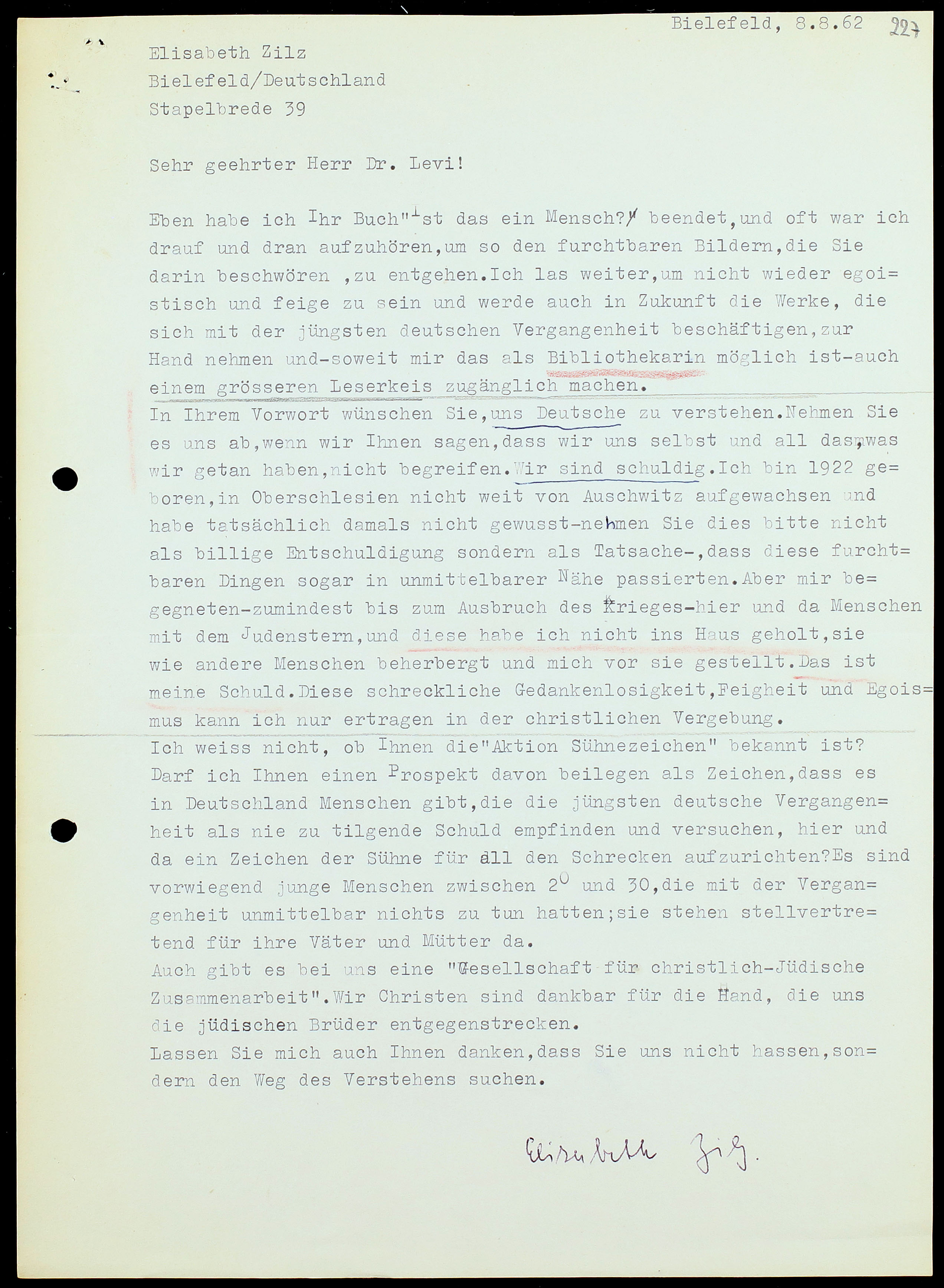 Elisabeth Zilz, bibliotecaria di Bielefeld cresciuta in Alta Slesia (non lontano da Auschwitz), scrive a Levi dopo aver letto Ist das ein Mensch?. Nel rievocare la sua infanzia e il suo impegno nel presente, la donna esprime un senso di colpa profondo nei confronti di se stessa e del proprio popolo.