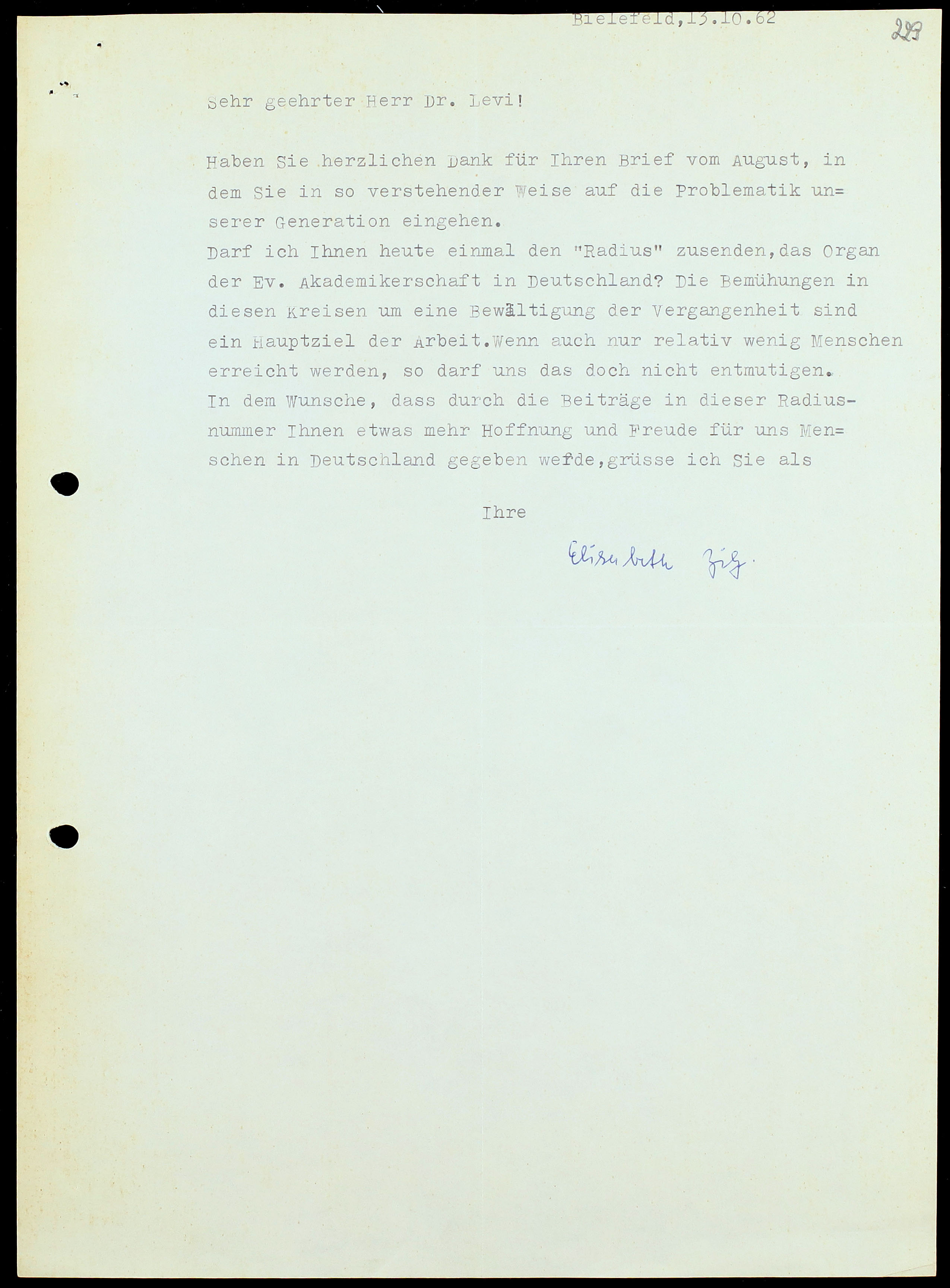 Zilz invia a Levi un numero di «Radius», la rivista degli Accademici Evangelici in Germania.
